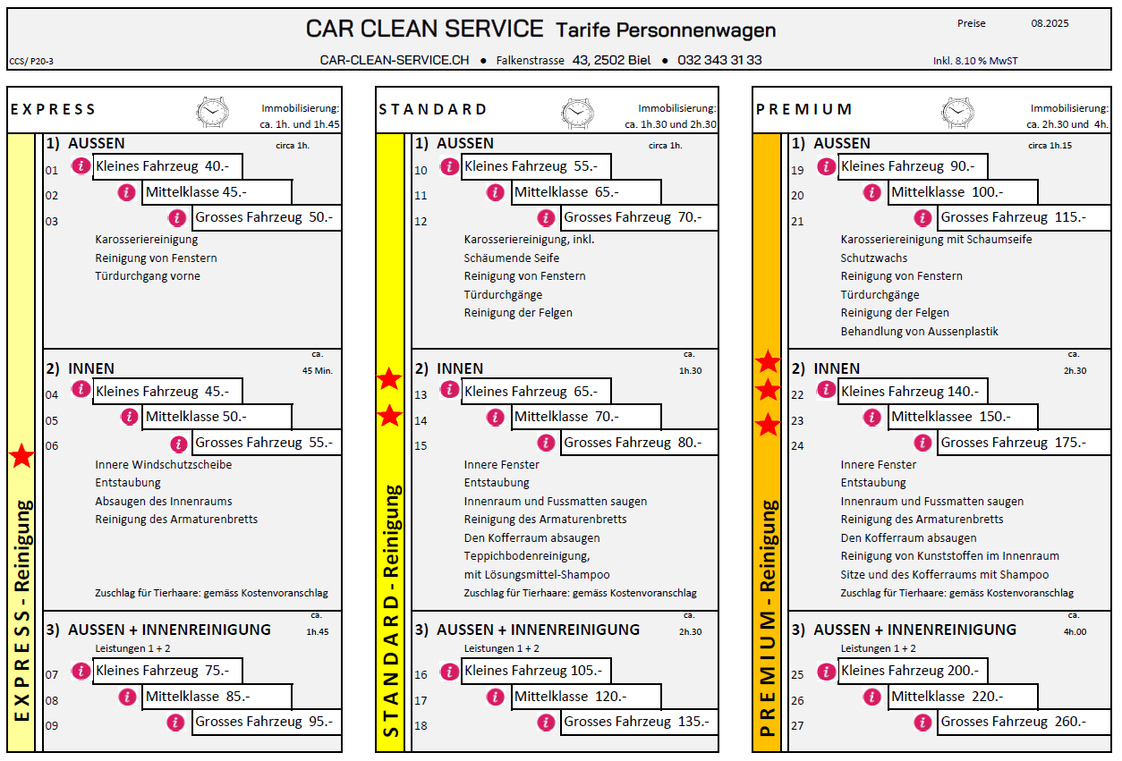 Hinweis: Die angegebenen Preise basieren auf einem Standardzustand des Fahrzeugs in Bezug auf Verschmutzung und Beschädigung. Bei starker Verschmutzung oder einem aussergewöhnlich schlechten Zustand kann eine Preisanpassung aufgrund der zusätzlich erforderlichen Reinigungszeit vorgenommen werden.